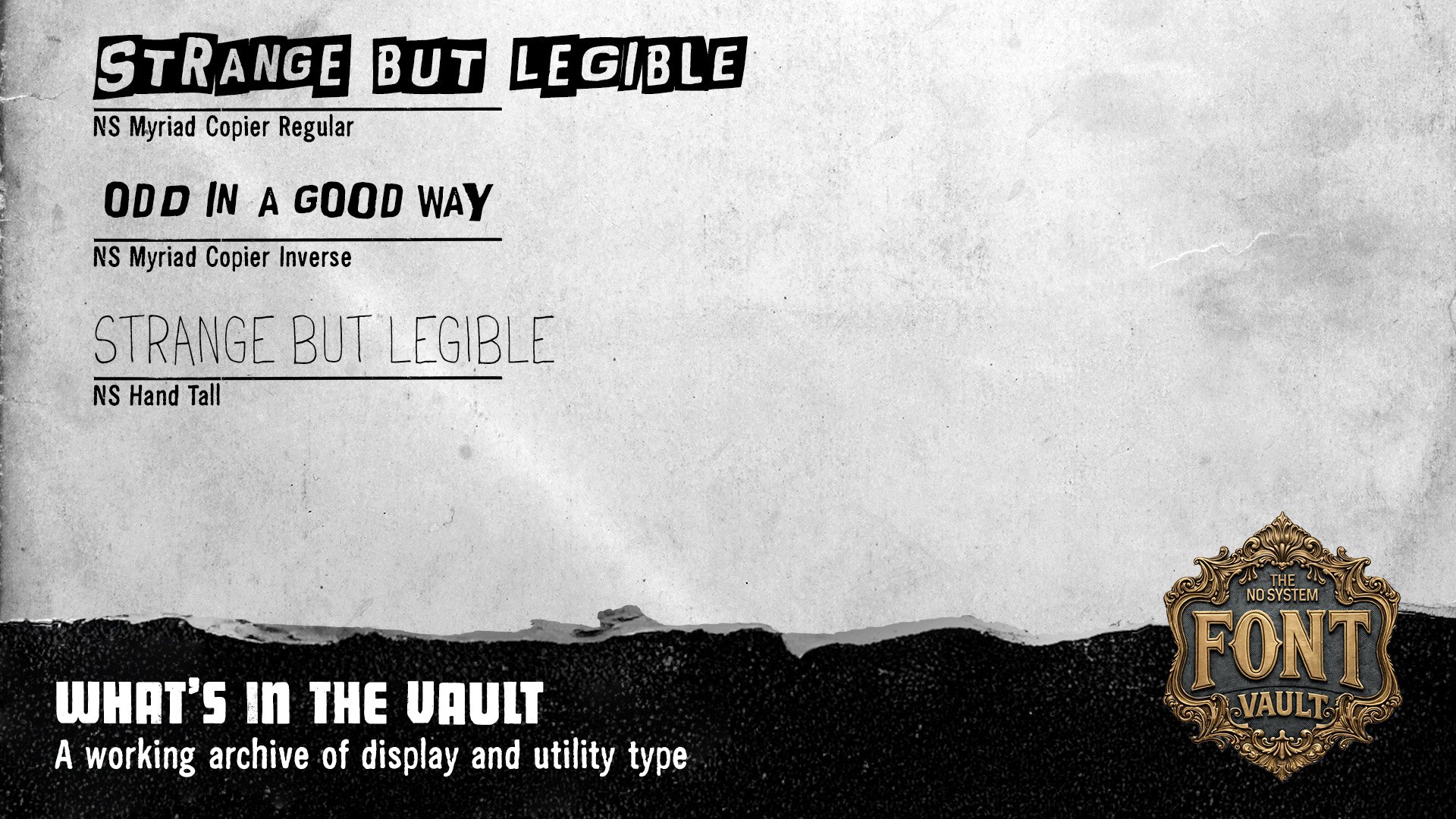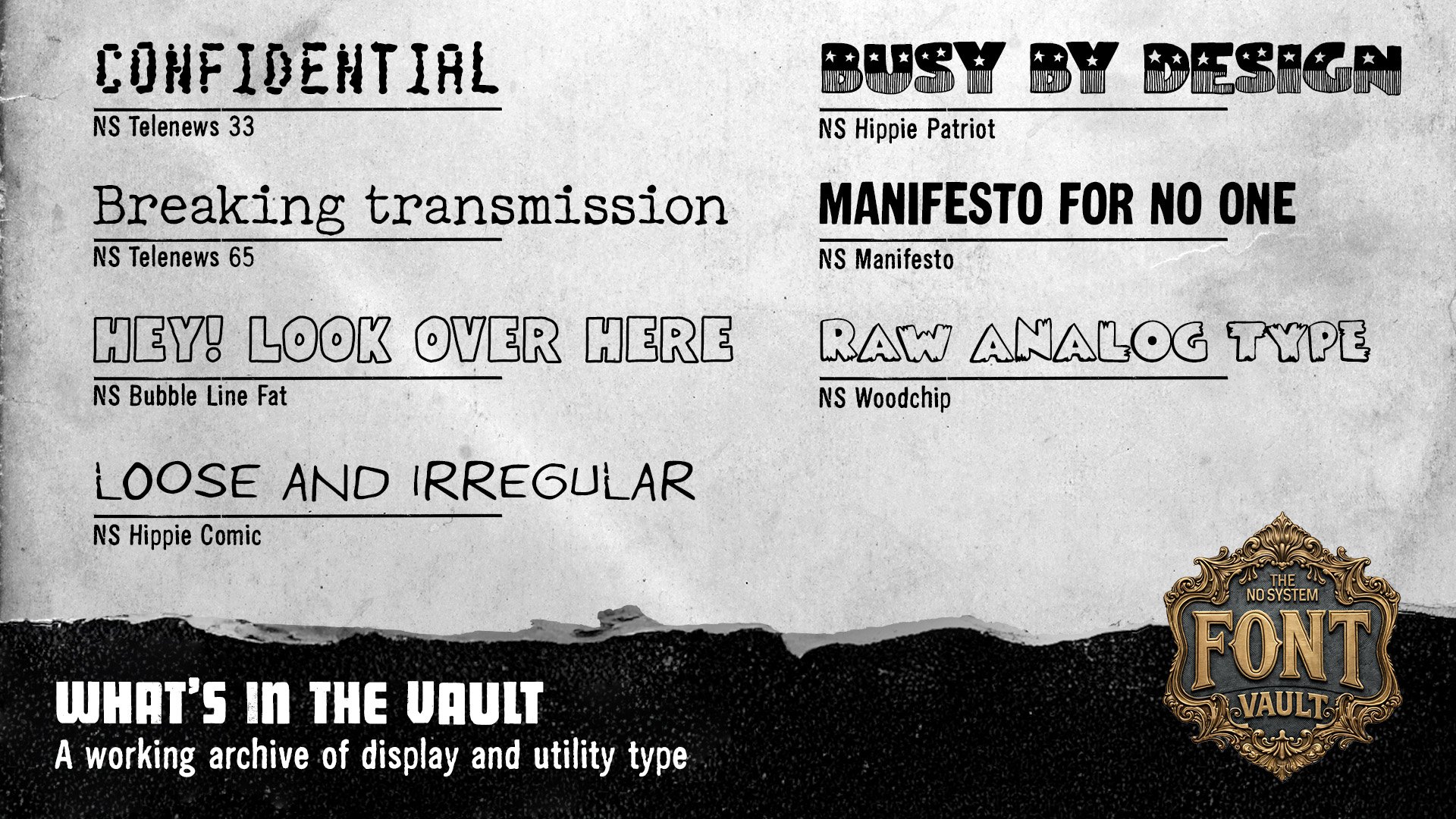 The NS Font Vault is a working archive of type rebuilt from vintage print, comics, circulars, and bureaucratic debris. These fonts are imperfect on purpose and built with real alternates so designers can make decisions, not accept defaults.
